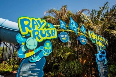 Com quase 20 metros de altura, a Ray Rush é onde os grupos de amigos e famílias podem se divertir em três experiências emocionantes diferentes, ao deslizar, se molhar e flutuar como nunca antes. Primeiro, os visitantes serão lançados a uma velocidade de 36 km/h por jatos de água, que impulsionarão as boias para a primeira de muitas seções de tubos fechados.