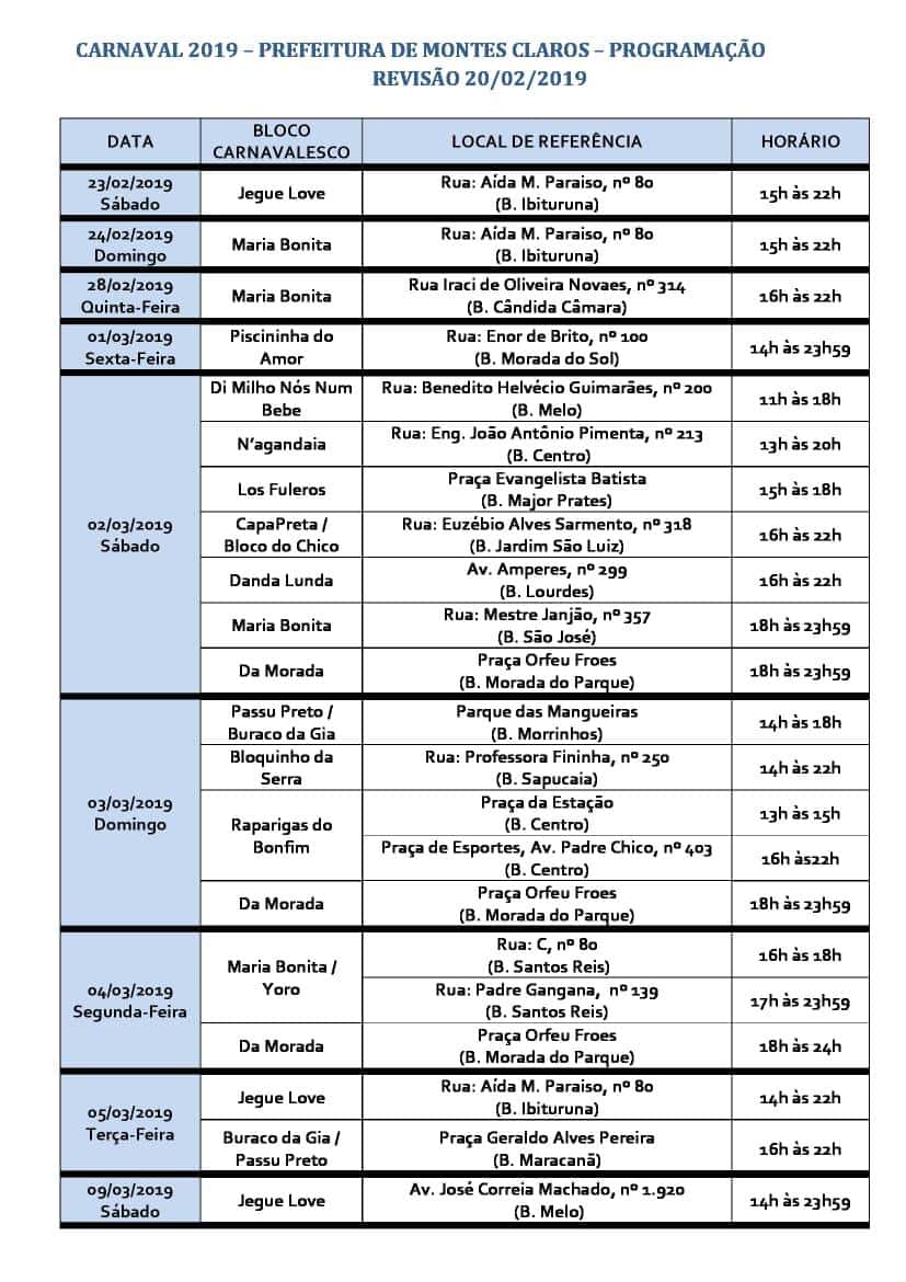 Montes Claros – A Prefeitura de Montes Claros divulgou a nova programação da edição 2019 do Carnaval da cidade. As mudanças serão nos dias 2 e dia 3 de março (sábado e domingo). Na oportunidade, novos blocos animarão os foliões. Houve também modificações nos locais de algumas atrações (confira a programação atualizada).