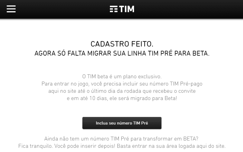 Após fazer login e conectar o Facebook ao TIM Beta, o site redireciona para uma página informando que a própria TIM concedeu um convite ao plano. Para continuar, é necessário preencher um breve cadastro com e-mail, senha e nome completo e concordar com os termos de adesão. A partir daí, já é possível incluir o número TIM Pré para a migração ao novo plano.